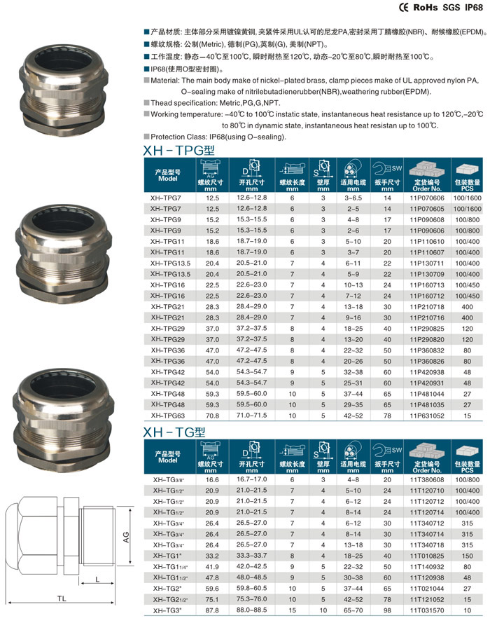 產品材質:主體部分采用鍍鎳黃銅,夾緊件采用UL認可的尼龍PA,密封采用丁腈橡膠(NBR)、耐候橡膠(EPDM)